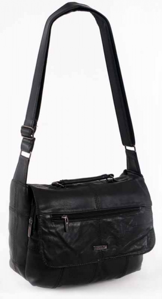Soft leather bag, three main compartments (one zipped) with internal zip pocket, mobile phone pouch and press stud over flap with additional zip, rear zip pocket, front zip pocket, side pocket and top grab handle.