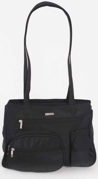 Medium size microfibre bag, two main compartments one with a internal zip pocket, three front zip pockets and a font mobile phone pouch. Available in Black.