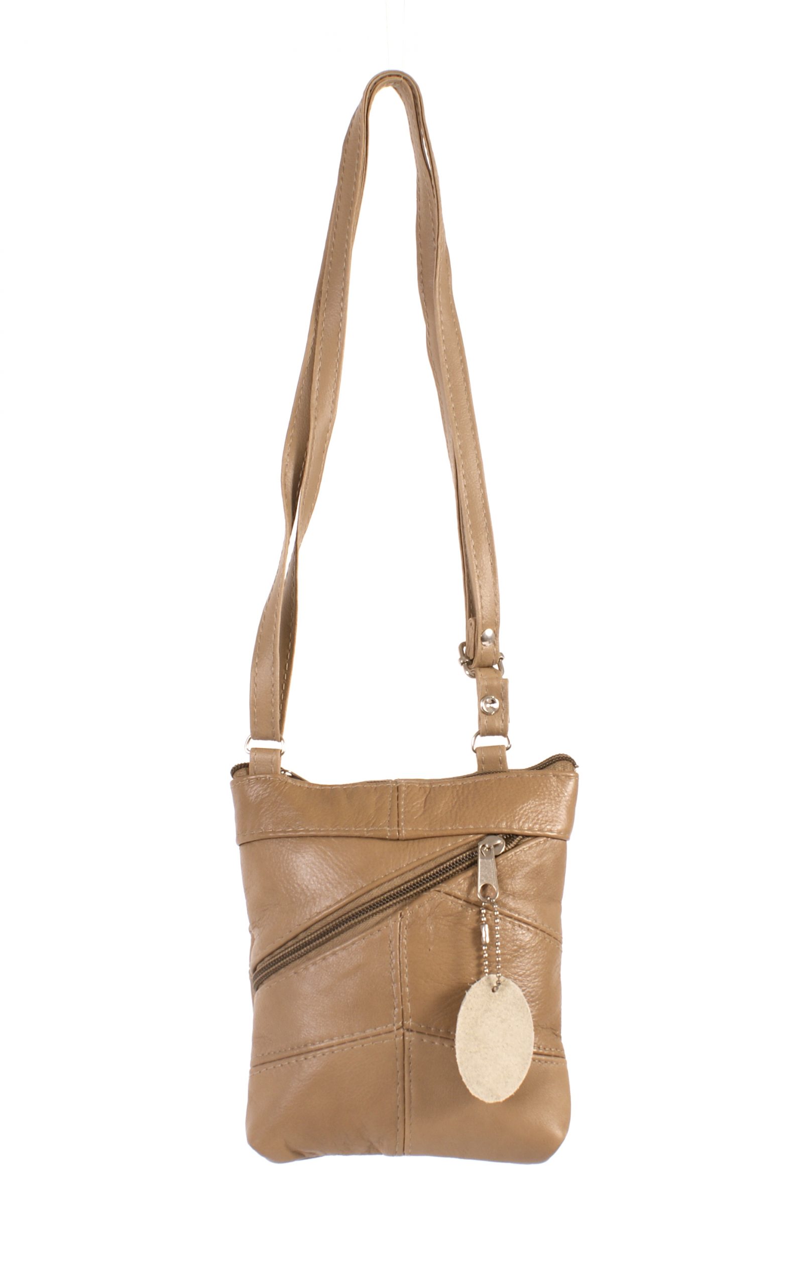 Small cow hide leather bag with one main zipped section and a front and rear zipped pocket with an adjustable shoulder strap.
