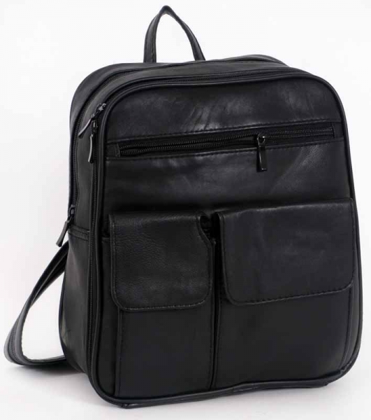 Leather bag, one main compartment with internal zip pocket, large front zip pocket with three split sections, front zip pocket and two velcro front pockets. Top leather grab handle Available in Black.
